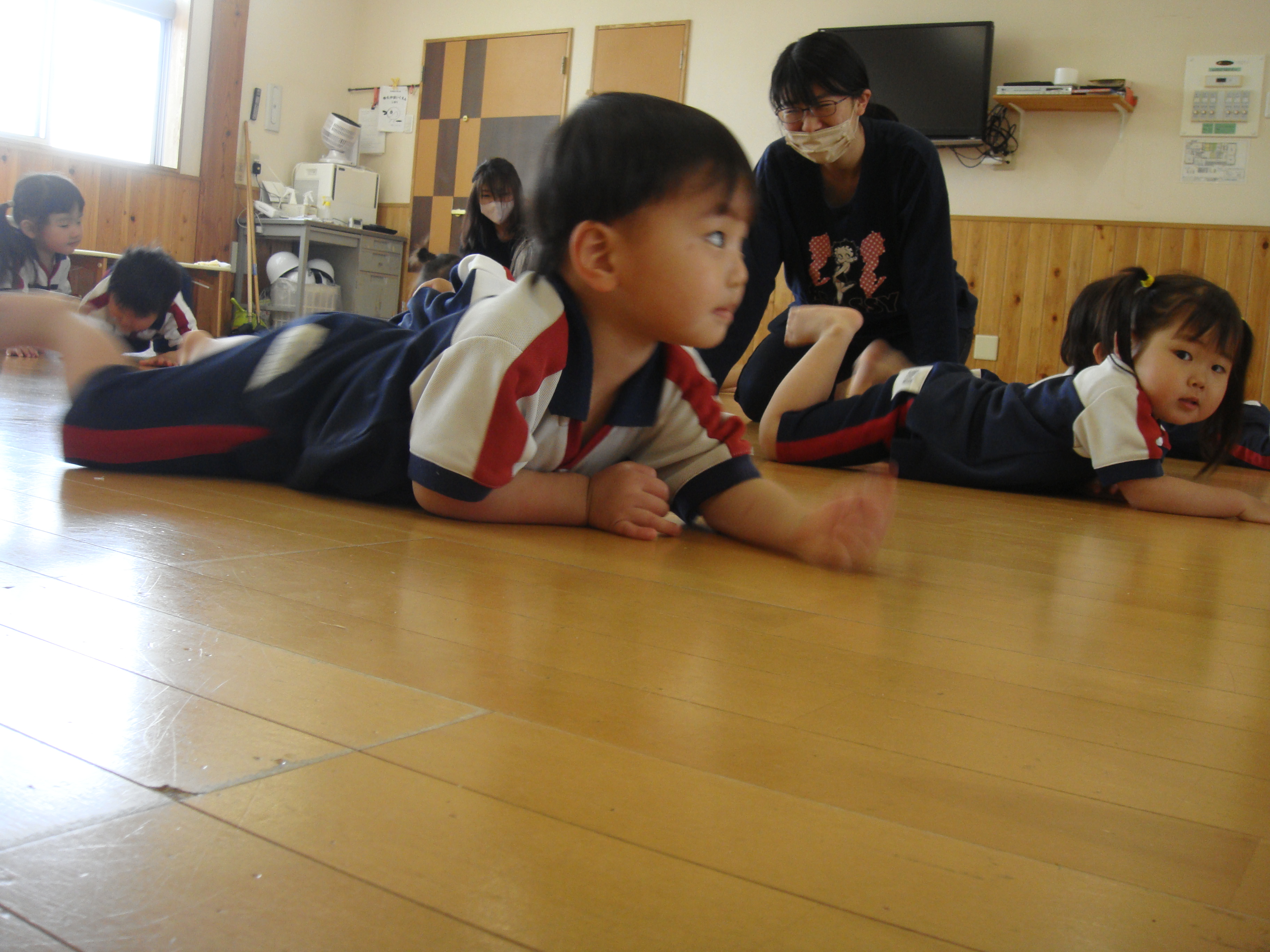 今日はリズム運動。りすぐみさんはお部屋で待機。