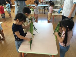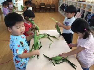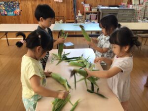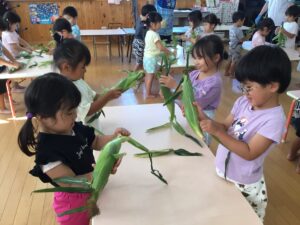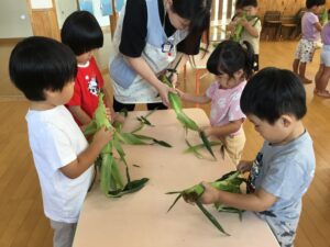 昨日、3歳児こあら組で「トウモロコシの皮むき」を行いました。